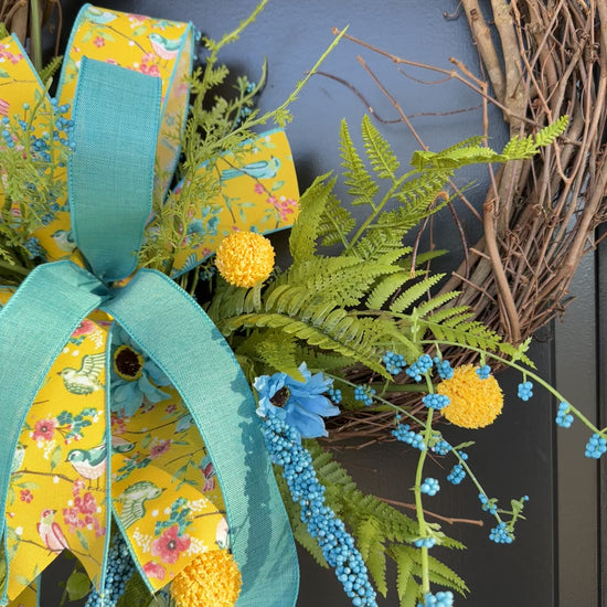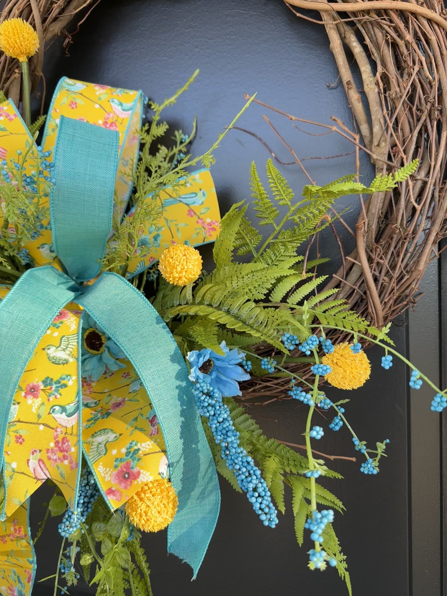 Bring a cheerful touch of spring to your front door with this handcrafted Bluebird Garden Spring Wreath. Designed on a natural grapevine base, this piece features vibrant greenery, bright yellow billy ball accents, delicate blue florals, and a stunning layered bow made with whimsical bird and floral ribbon paired with soft turquoise tails.