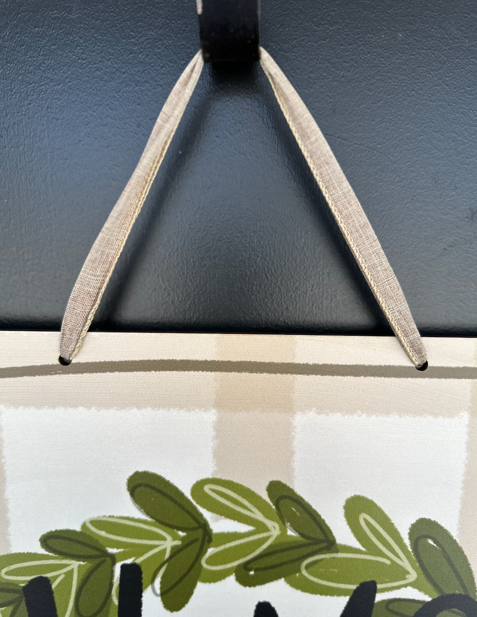 A charming square door hanger featuring Home Sweet Home on a soft tan and beige gingham background, perfect for adding a warm and welcoming touch to your front door. Measuring 24 inches at its longest point, each hanger is crafted from sturdy 1/4-inch material and finished with crisp, UV-printed artwork for rich, long-lasting color designed to be enjoyed season after season.