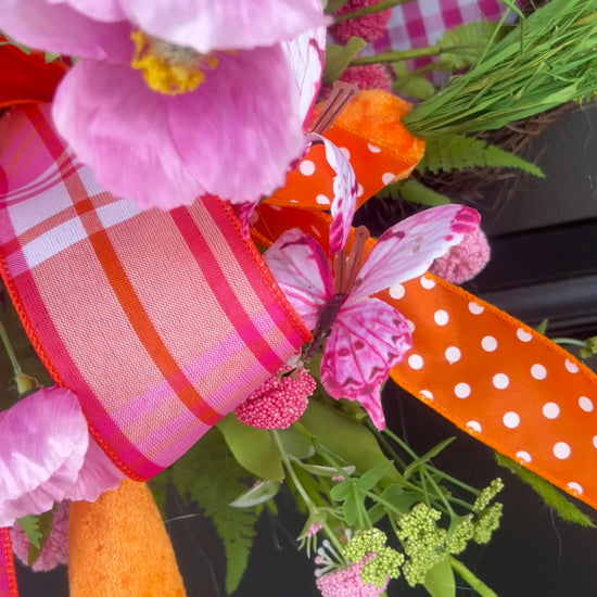 This handcrafted Pink Gingham Bunny Door Hanger features a classic grapevine bunny silhouette layered over bright gingham fabric and finished with a vibrant designer bow, spring florals, and playful carrot accents.