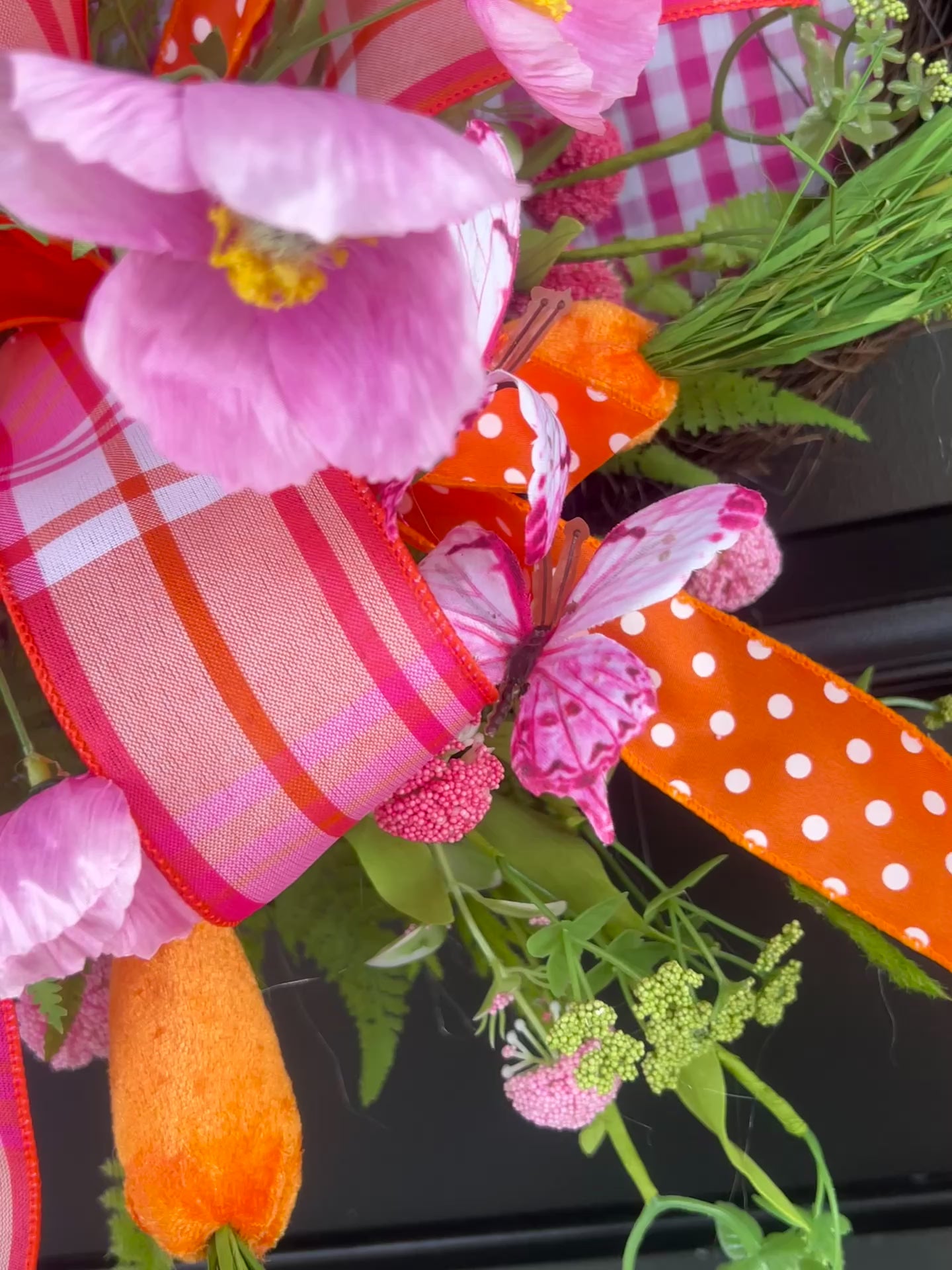 The combination of preppy gingham, fresh greenery, and soft florals creates a warm, welcoming statement perfect for Easter celebrations and spring porch styling. Designed to bring joyful personality to your front door, this piece blends whimsical seasonal décor with boutique craftsmanship.