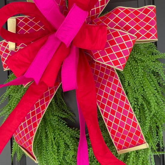 This 26 x 32 inch UV-resistant bead grass wreath is finished with a stunning crimson and hot pink designer bow, creating a romantic and eye-catching statement for your front door.